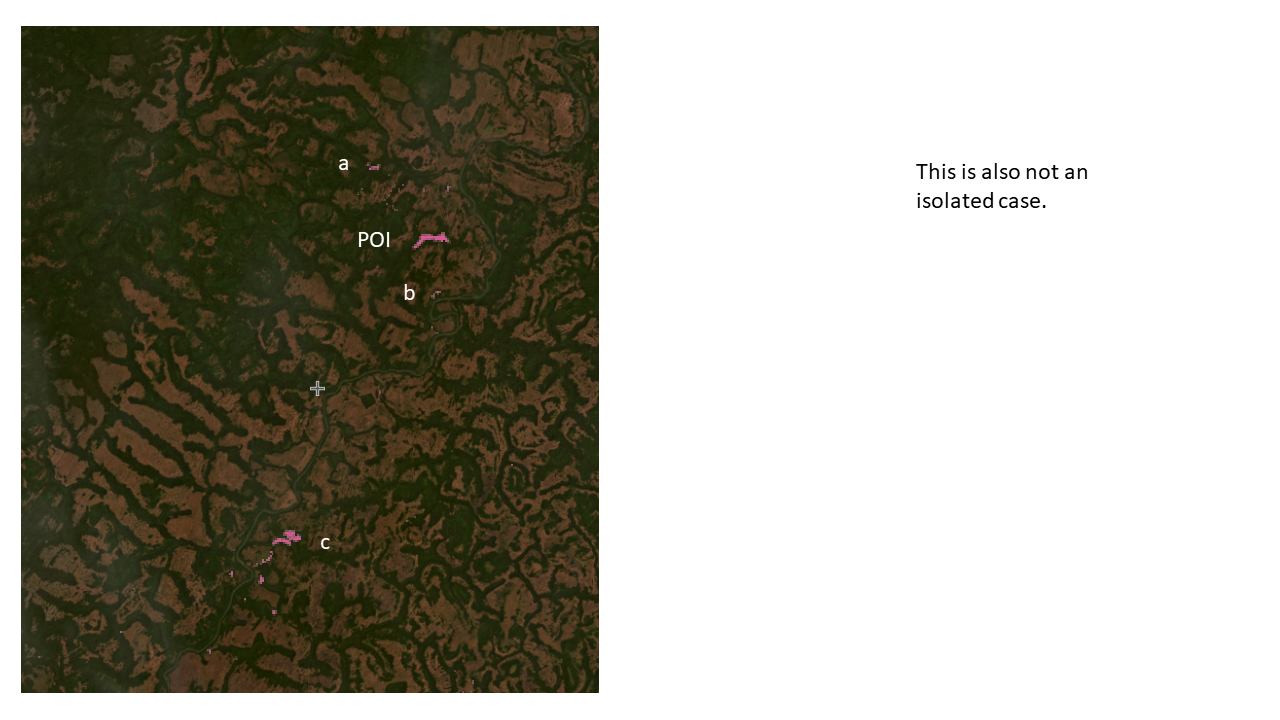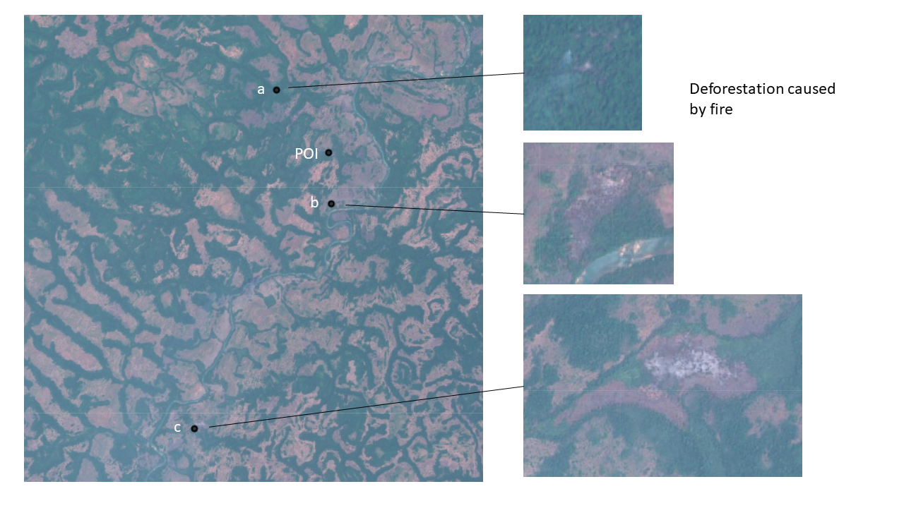 In fact, deforestation with similar circumstances occurred at three other points (a, b and c) all within a 50 km radius of the POI.