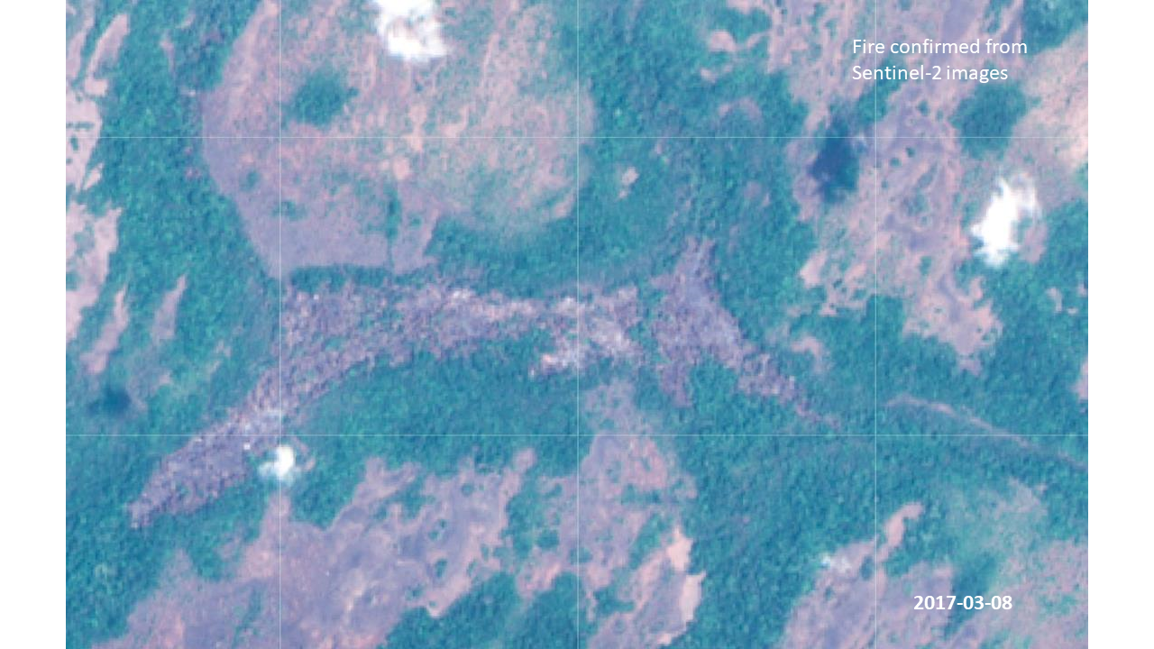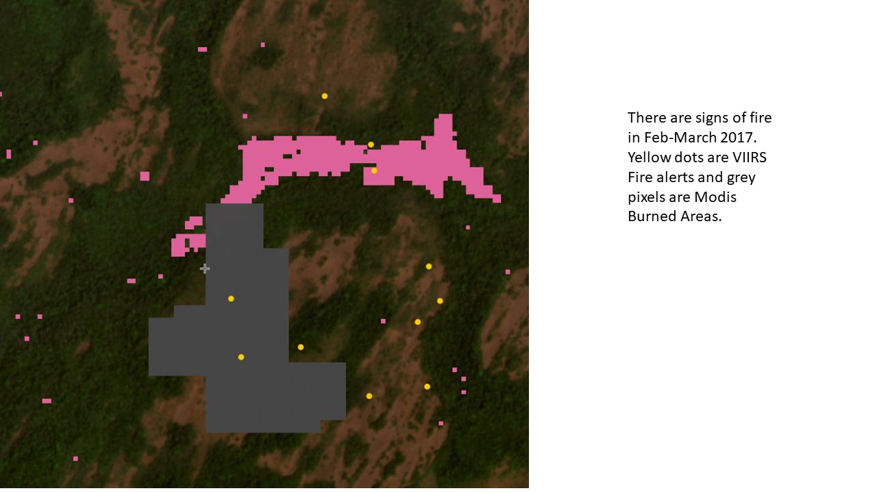 Fire has been a key driver of habitat dynamics for millennia. In dense humid forests, fire usually results in forest clearing, while savannah vegetation is more resilient to fires. People sometimes use fires in forests to clear land for agriculture. Using data from VIRRS and Modis Burned Areas we investigated if the detected deforestation was perhaps caused by fire.