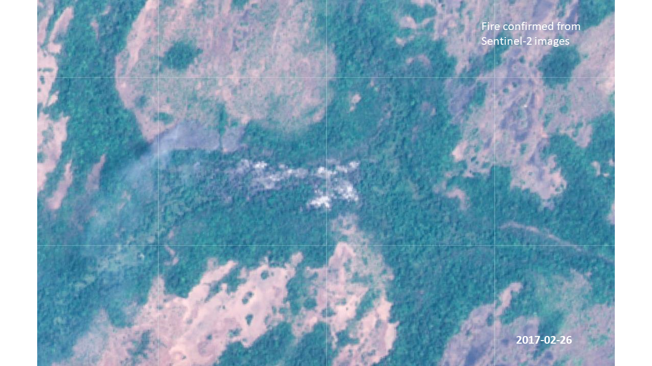 Fires caused by lightning usually happen in the late dry or early rainy season which is around March/April. It is thus very possible that lightning started this fire in late February. But, more evidence from the surroundings may suggest otherwise. It seems like the point of interest (POI on the below photo) was not an isolated case.