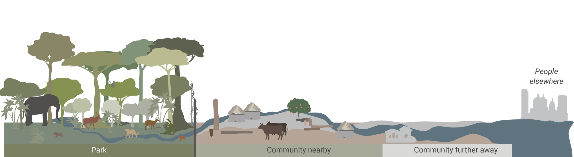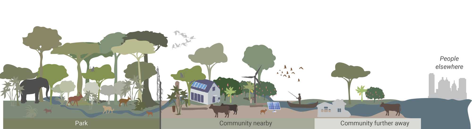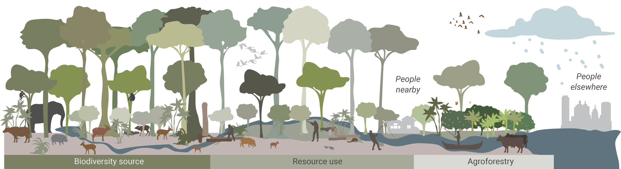 In the example, the biodiversity source focuses on conserving biodiversity, allowing ecological and evolutionary processes to unfold resulting in an overflow of quality resources such as water, meat and wood for people nearby. It can possibly further flow into a more agroforestry-focused area offering sustainable grazing lands and well-pollinated crops. Such a system may also offer materials and carbon sequestration services to people elsewhere.